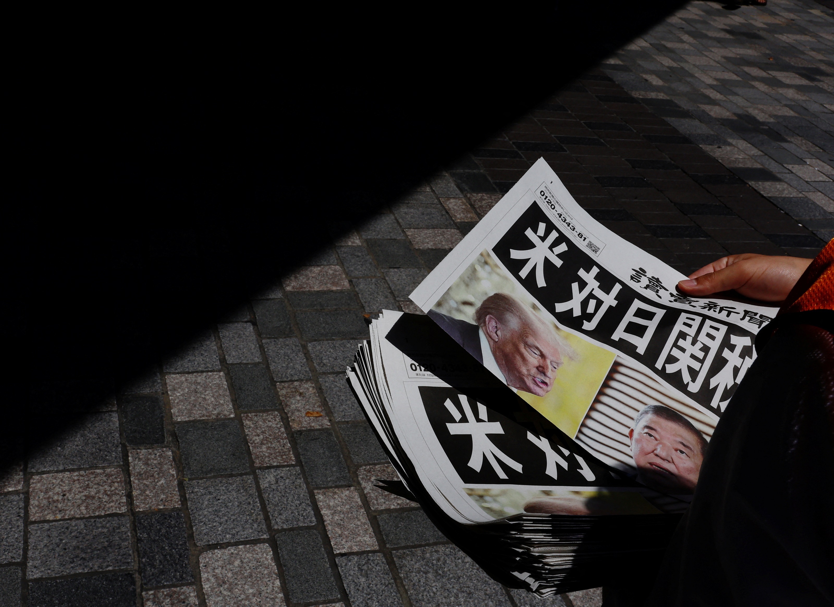 7月23日,在日本东京街头,一名工作人员分发报道美国与日本达成贸易协议的《读卖新闻》特刊。新华社发