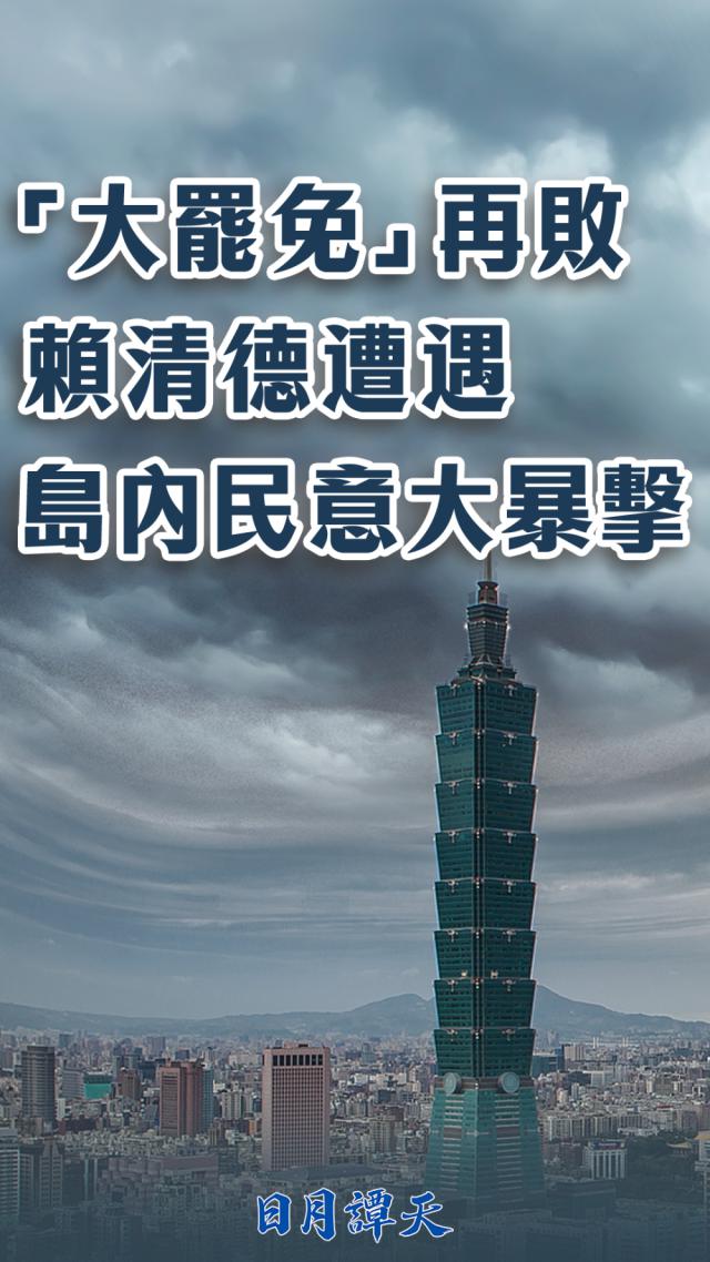对于赖清德的惨败,中时新闻网、NOWnews、《太报》等多家岛内媒体以"‘大罢免’大翻车"等为题展开报道,"罢免案全数遭否决"等迅速登上台湾雅虎新闻热榜,《旺报》刊发社评指"反罢民意雷声响"。岛内分析人士指出,赖清德长期无视民意、违逆民意,大搞政治操弄,这样的结果在意料之中。在谭主看来,"大罢免"一败再败、以满盘皆输收场,表明赖清德上台一年三个月后,已经被岛内民意彻底否定。