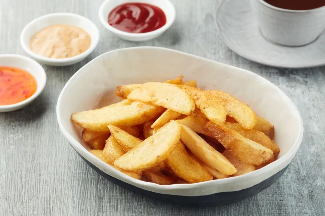 传统的美式薯条大多数加辣椒盐,还有各种酱料:番茄酱、蛋黄酱、蜂蜜芥末酱、烧烤酱、塔塔酱等。美国一度流行薯条蘸奶昔:薯条的盐粒加上奶昔里的奶油,形成丰富的咸甜口感,确实美味。